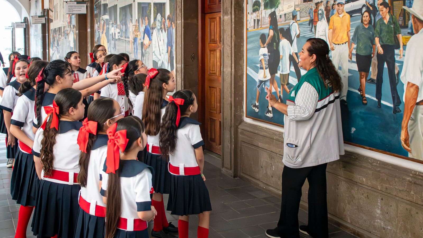 Además, se les explicó el significado de los murales que rodean el segundo piso, los cuales representan distintos momentos históricos y culturales del municipio. En ese mismo nivel, las alumnas ingresaron al Salón de Cabildo, uno de los espacios más emblemáticos del recinto, donde se toman decisiones importantes para el desarrollo de la ciudad.