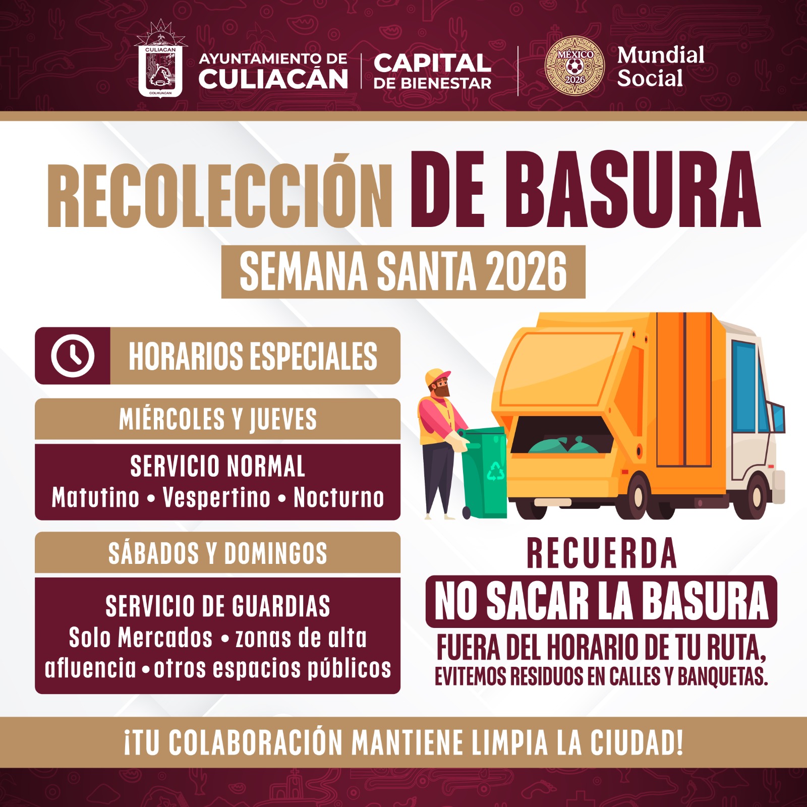 CULIACÁN, SINALOA.- La Dirección de Servicios Públicos informa a la ciudadanía sobre las modificaciones en el servicio de recolección de basura con motivo del periodo vacacional de Semana Santa 2026.
