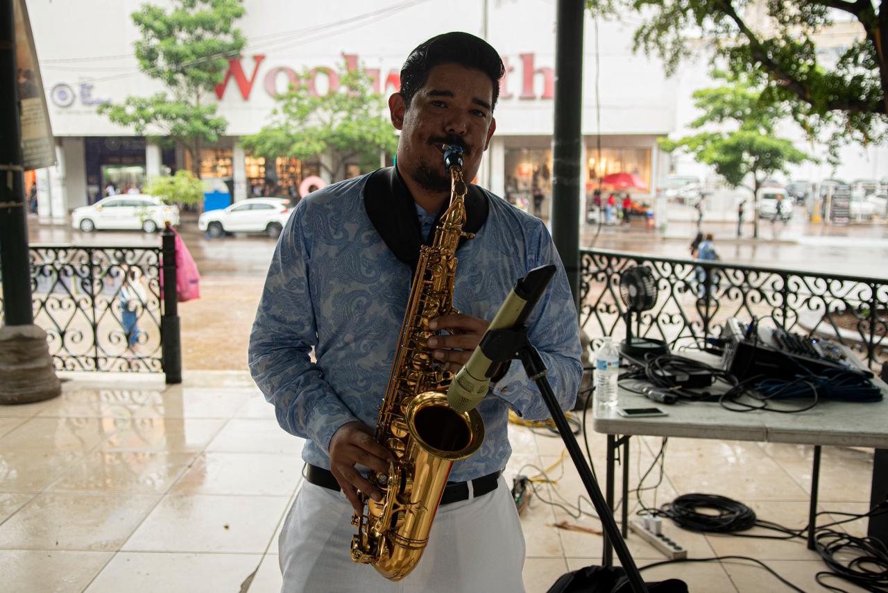 La programación inició a las 9:00 horas con la interpretación de Erick Castro, quien presentó un repertorio en saxofón y clarinete, creando un ambiente propicio para el disfrute de la música en vivo.