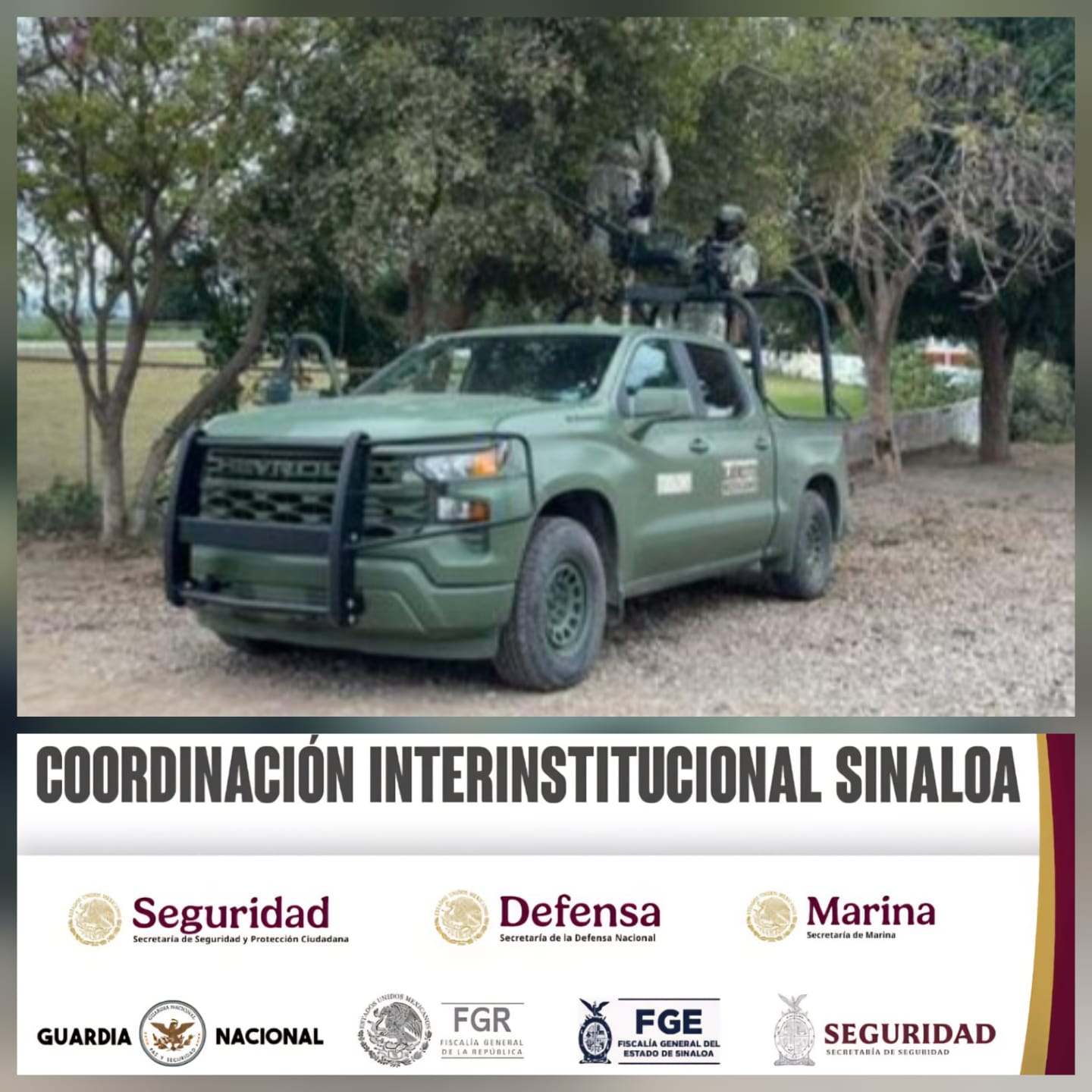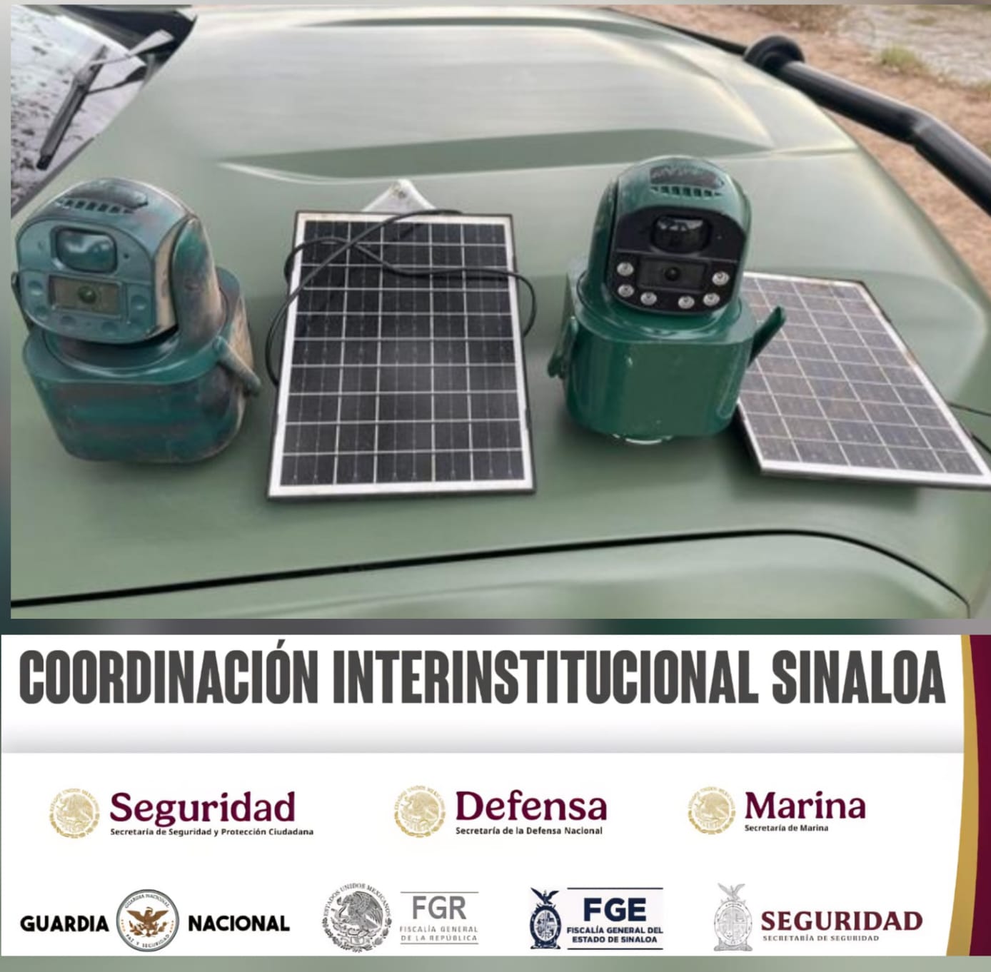 Al realizar reconocimientos terrestres en las comunidades de El Bledal y Lo de Reyes, en el municipio de Navolato, personal militar localizó dos cámaras de videovigilancia con celda solar, las cuales estaban instaladas y ocultas entre las ramas de los árboles, y se presume que eran utilizadas para vigilar las acciones implementadas por las autoridades en dicho sector.