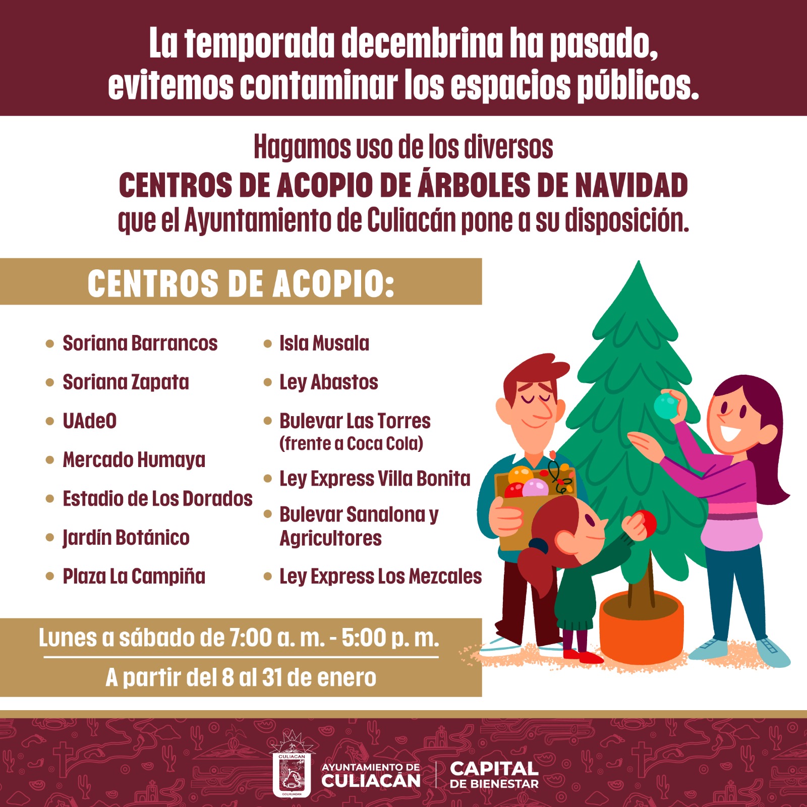 CULIACÁN, SINALOA.- Una vez concluida la temporada decembrina, el Ayuntamiento de Culiacán exhorta a la ciudadanía a no desechar los arbolitos navideños en la vía pública y a hacer uso de los centros de acopio que estarán habilitados del 8 al 31 de enero, en un horario de lunes a sábado de 7:00 a. m. a 5:00 p. m.