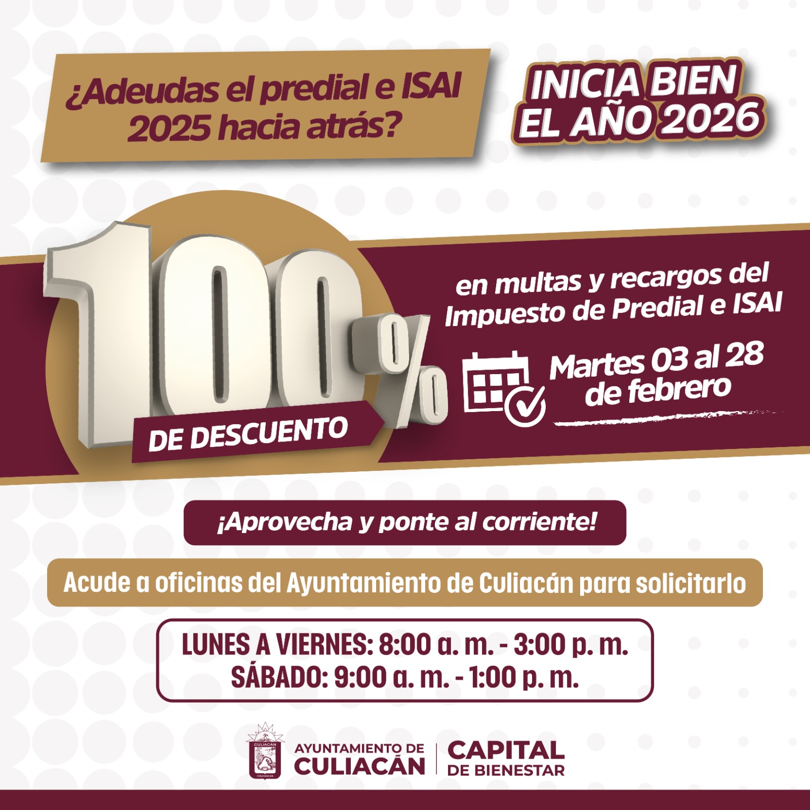 CULIACÁN, SINALOA.- Con el objetivo de apoyar la economía de las familias y fortalecer la recaudación municipal, el Ayuntamiento de Culiacán puso en marcha la promoción “Inicia Bien el Año 2026”, que contempla un 100 por ciento de descuento en multas y recargos del Impuesto Predial e ISAI, aplicable a adeudos de 2025 y años anteriores.