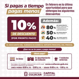 La directora de Ingresos del municipio, Hortencia Cota González, informó que este programa estará vigente hasta 28 de febrero del presente año, e invitó a la ciudadanía a acercarse para regularizar su situación fiscal y aprovechar los beneficios disponibles.