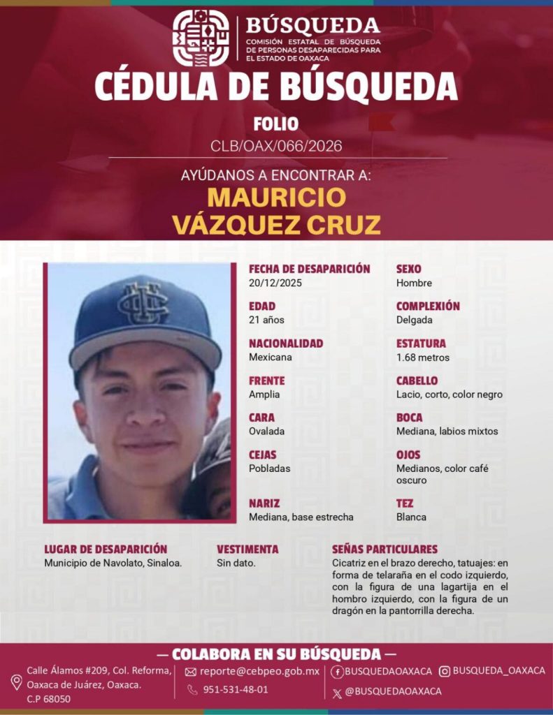 MÉXICO (Por Diana Manzo).- Mauricio Vázquez Cruz es un joven mixteco de 21 años de edad reportado como desaparecido desde hace tres meses. Fue visto el 20 de diciembre de 2025 en el campo agrícola de la empresa “Viva Organizada” ubicada en la Villa Juárez Navolato, Sinaloa y desde entonces su madre, Elena Cruz Ramírez no sabe nada de su paradero.