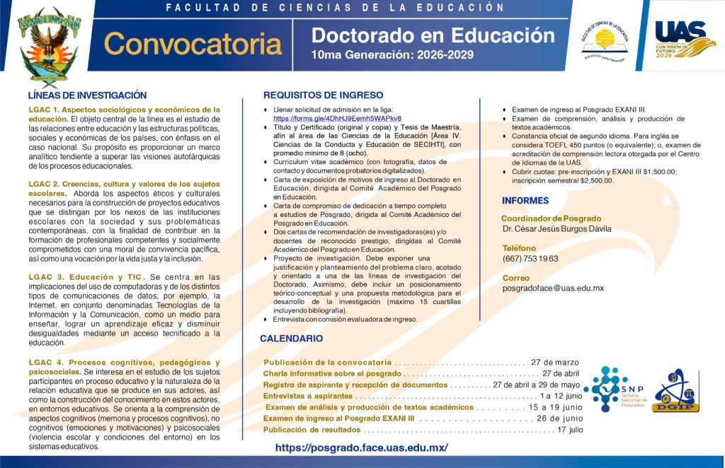 CULIACÁN, SINALOA.- Posgrados con rigor académico, trayectoria consolidada y altos estándares de calidad: esta es la apuesta que impulsa la Facultad de Ciencias de la Educación (FACE) de la Universidad Autónoma de Sinaloa (UAS) al abrir su convocatoria para la Maestría (11.ª generación) y el Doctorado en Educación (10.ª generación), dirigidos a profesionales que buscan formarse en el campo de la investigación educativa.