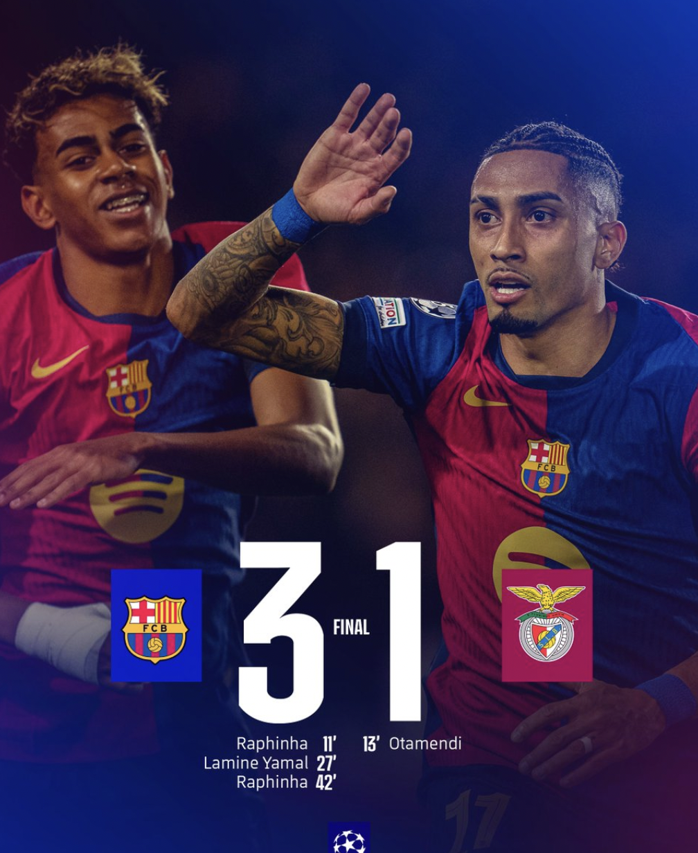 Benfica.- Barcelona es el primer clasificado a Cuartos de Final de la UEFA Champions League 2024-2025 al imponerse 3-1, global 4-1, al Benfica, encuentro de vuelta celebrado este martes en el Estadi Olímpic Lluís Companys.