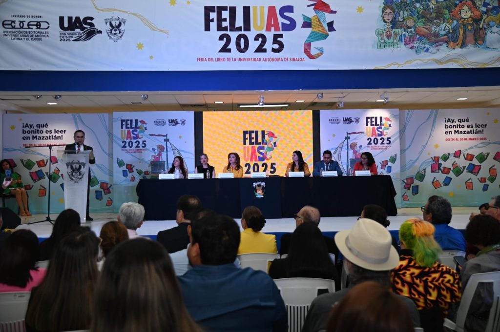 Mazatlán, Sinaloa.- Con el lema “¡Ay, qué bonito es leer en Mazatlán!” y la presencia de universidades de Colombia, Perú, Ecuador, Chile, Costa Rica y México y la participación de 34 casas editoriales universitarias públicas y comerciales, la Feria del Libro de la Universidad Autónoma de Sinaloa (UAS), FeliUAS 2025, abrió sus puertas para reafirmarse como una de las más emblemáticas y tradicionales en el país, en esta edición con 54 presentaciones de libro, 17 talleres y 54 mesas de debate, conferencias y espectáculos infantiles.