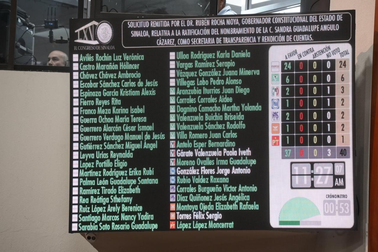 La votación se realizó mediante tablero electrónico, registrándose 37 votos a favor, por lo que con esta ratificación, Angulo Cázarez asume formalmente la titularidad de la Secretaría de Transparencia y Rendición de Cuentas, desde donde ejercerá las funciones de órgano de control interno del Ejecutivo del Estado.