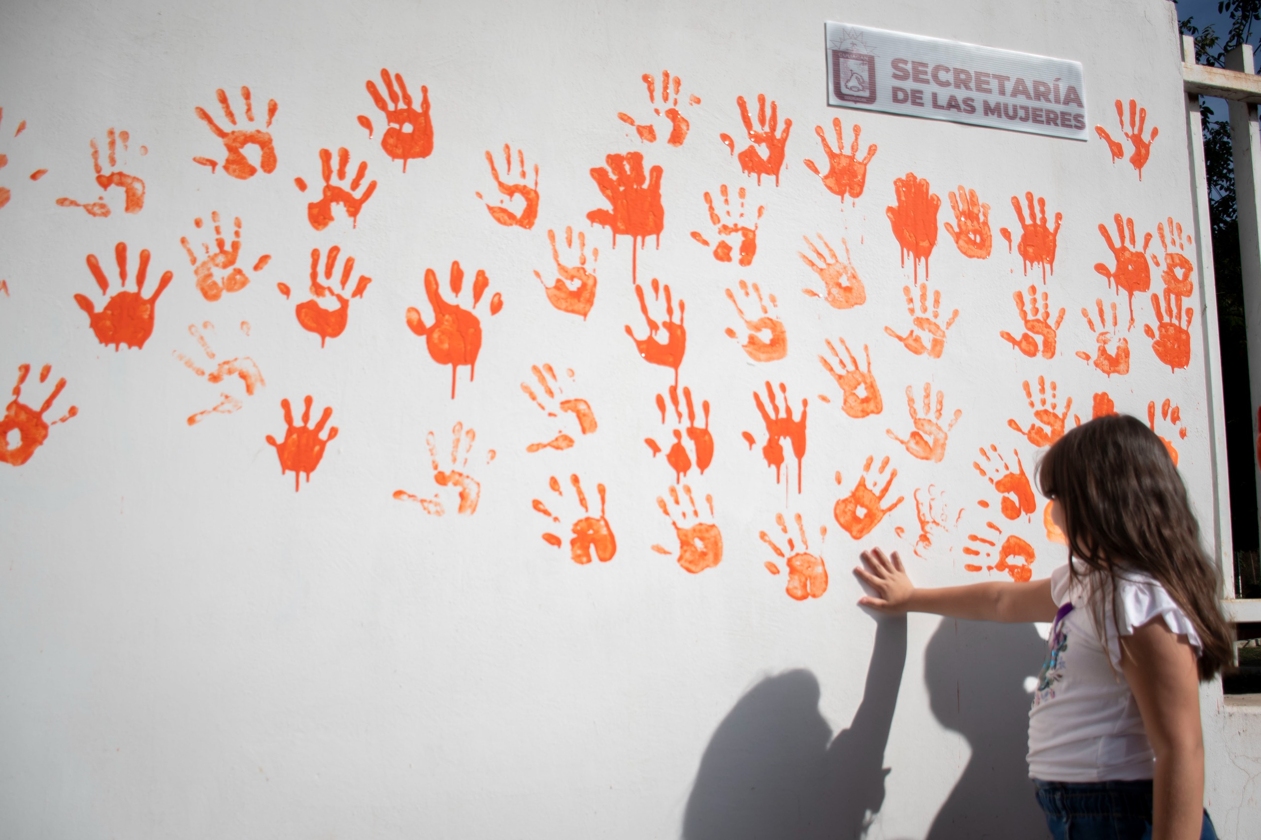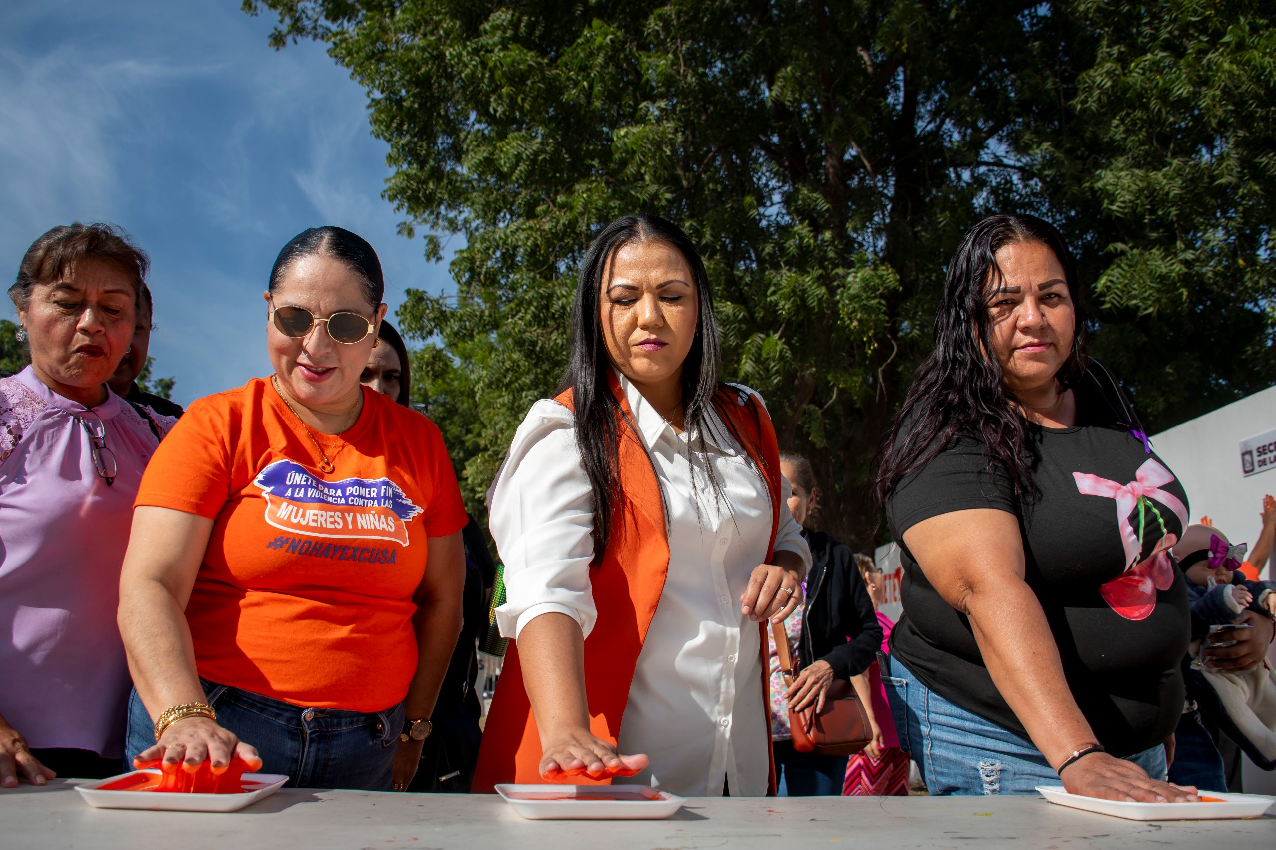 La primera actividad fue “Únete: Pinta de Manos”, dinámica en la que las asistentes impregnaron su mano derecha con pintura naranja y la plasmaron en un muro, simbolizando su unión al movimiento, así como su rechazo absoluto a la violencia en cualquiera de sus formas.