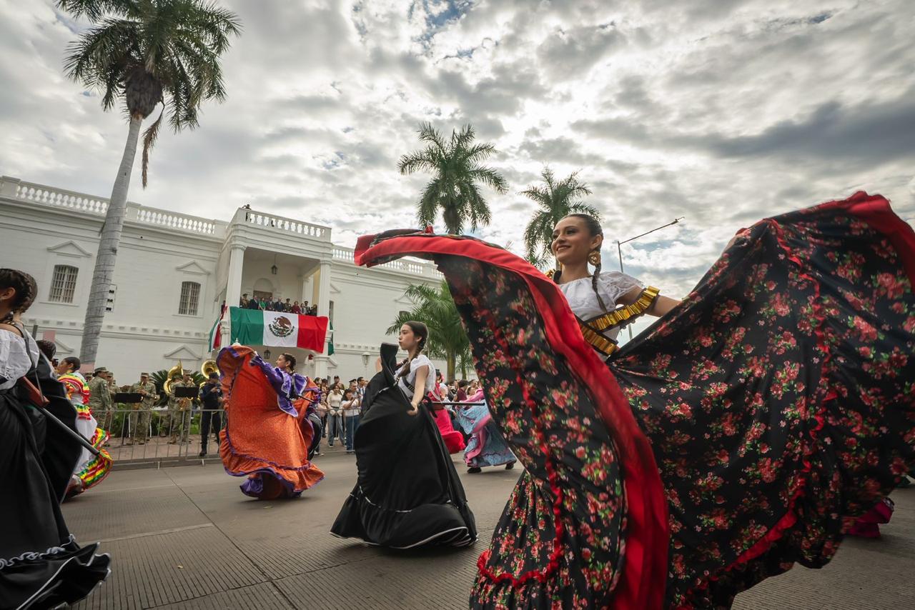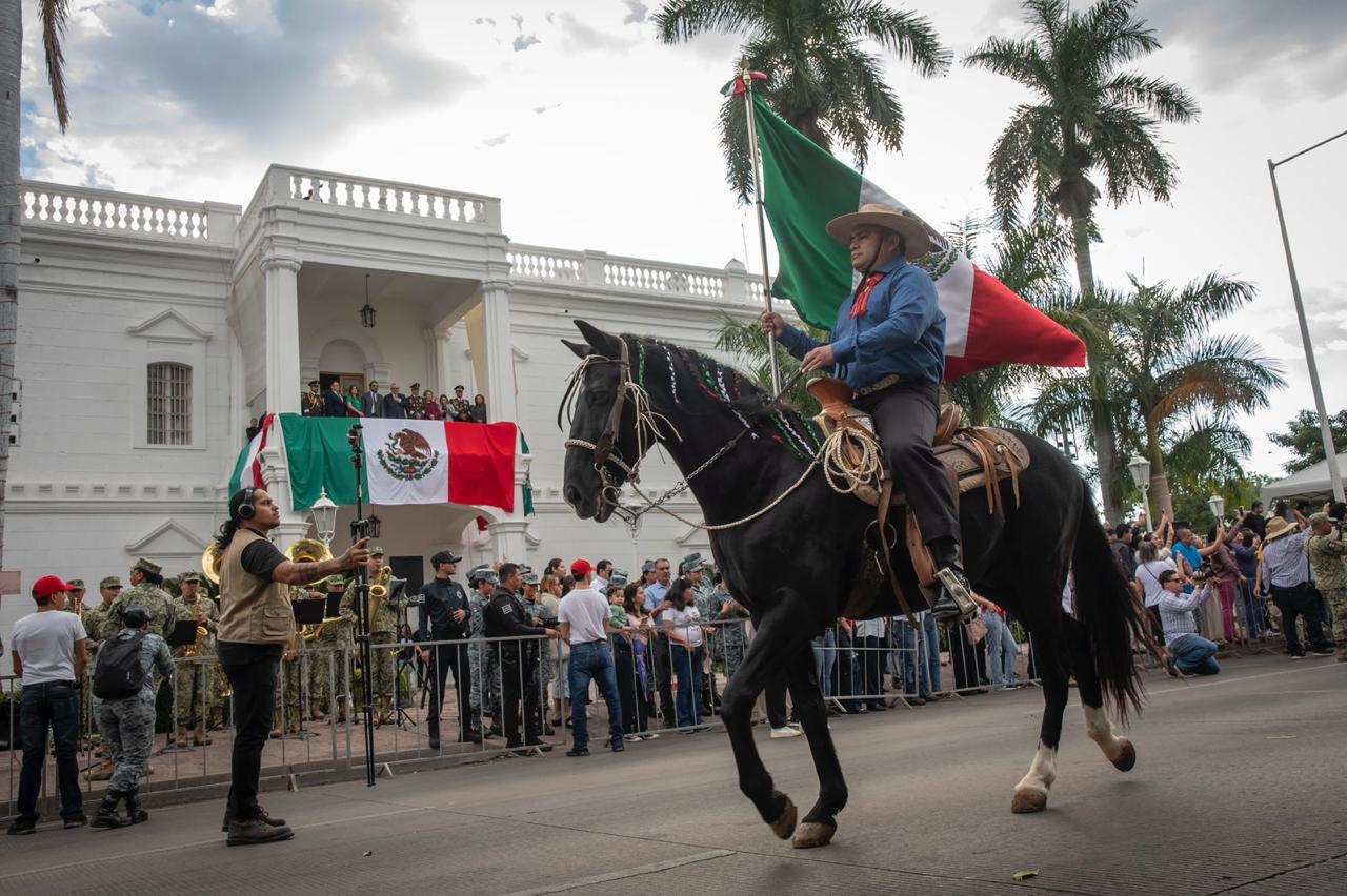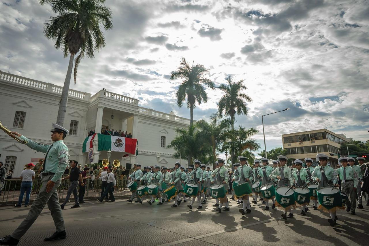 Desde el balcón del Ayuntamiento, el alcalde Juan de Dios Gámez Mendívil, acompañado por el gobernador del estado Rubén Rocha Moya, el cuerpo de regidores, la síndica procuradora y autoridades militares, observó la ceremonia protocolaria mientras los contingentes avanzaban por la avenida Álvaro Obregón.
