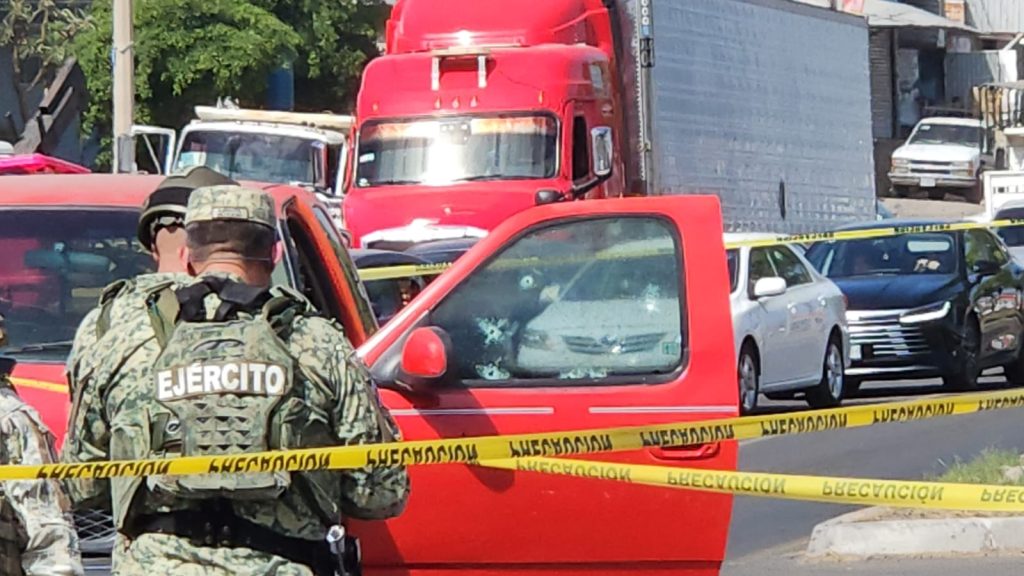 La unidad de la víctima presentó múltiples impactos de arma de fuego en la carrocería y cristales del lado del conductor, así como una de las llantas quedó ponchada a causa de los balazos.