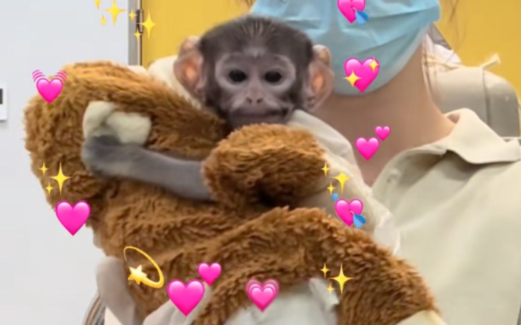 En el video, se observa al pequeño mono junto a su peluche.