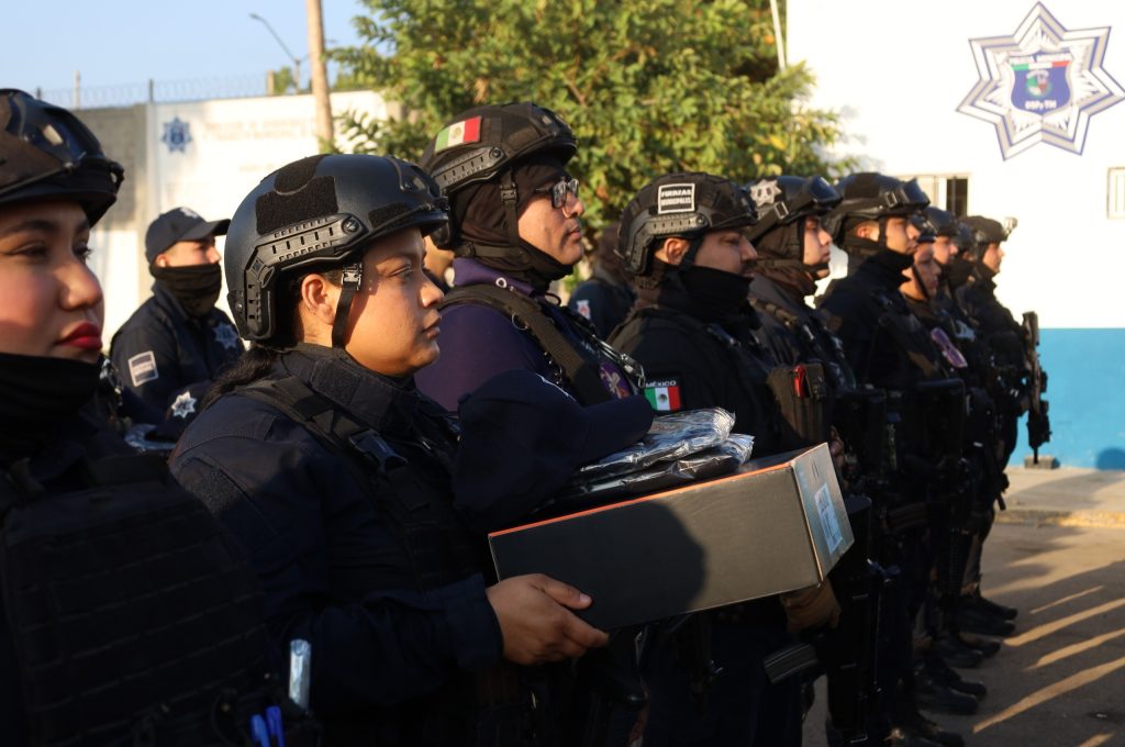 Durante el evento, en las instalaciones de la base de la policía municipal, se llevó a cabo la entrega de uniformes que incluyen camisas, pantalones tácticos, botas y gorras, equipamiento que fortalece la identidad institucional de los elementos y dignifica su imagen ante la ciudadanía.