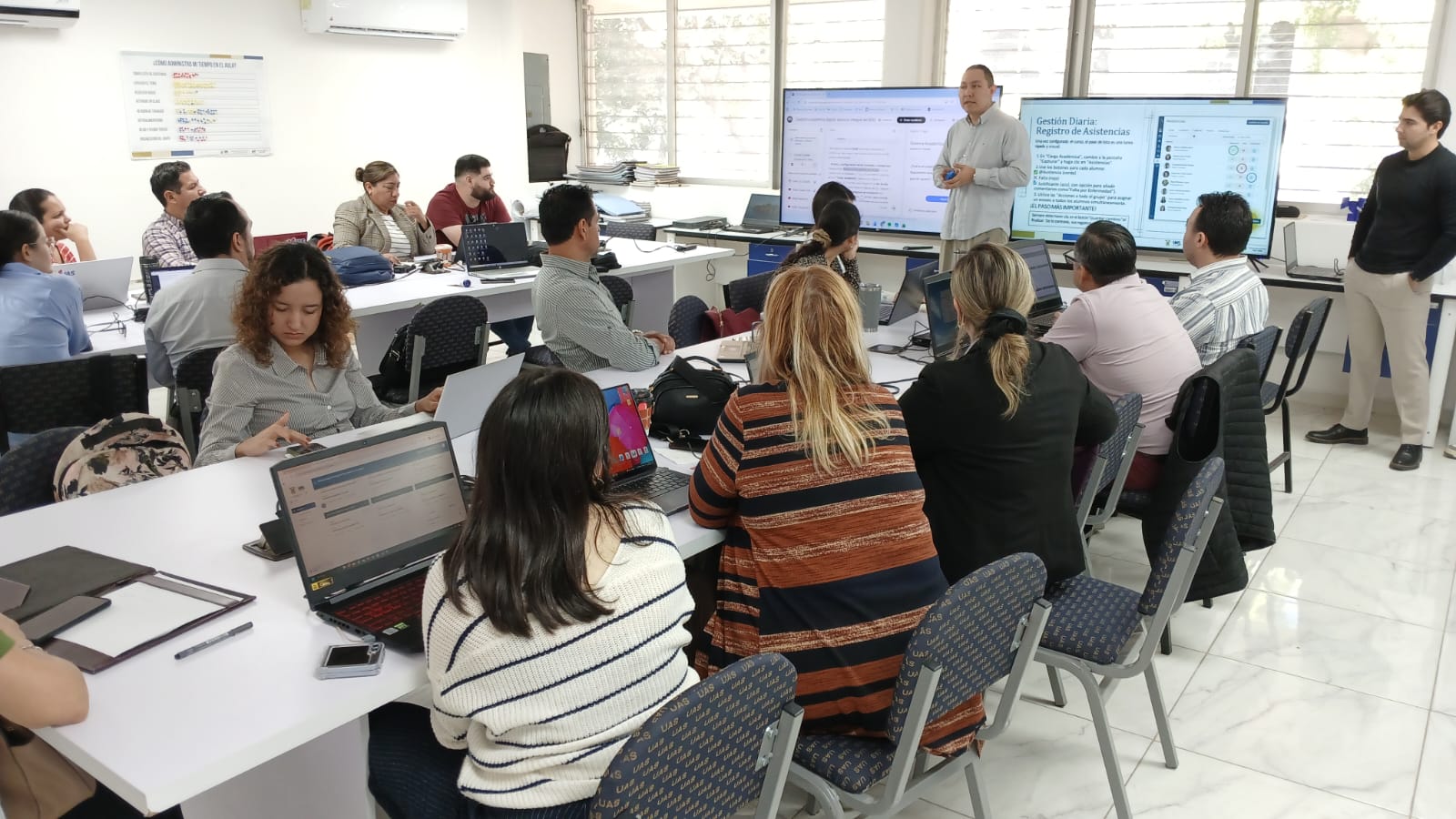 Durante la capacitación el maestro Luis Diego Peregrina García, secretario académico de la facultad explicó a los participantes sobre el manejo del nuevo sistema de gestión académica que se implementa desde la Dirección de Servicios Escolares y que viene a integrarse a las plataformas que ya tiene la universidad, permitiendo detectar áreas de oportunidad y fortalecer los procesos de acompañamiento estudiantil.