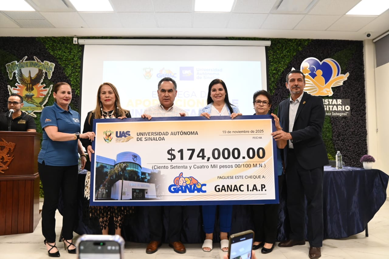Culiacán, Sinaloa.- En una muestra de generosidad y compromiso con la sociedad y especialmente con la niñez, la Universidad Autónoma de Sinaloa (UAS) entregó una donación de 174 mil pesos a Ganac, A.C, asociación que atiende a niños con cáncer, cifra que se obtuvo de aportaciones voluntarias de directores de unidades académicas y funcionarios universitarios.