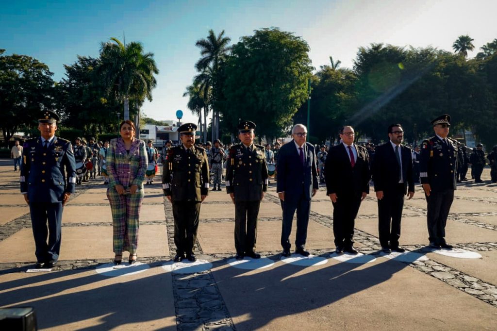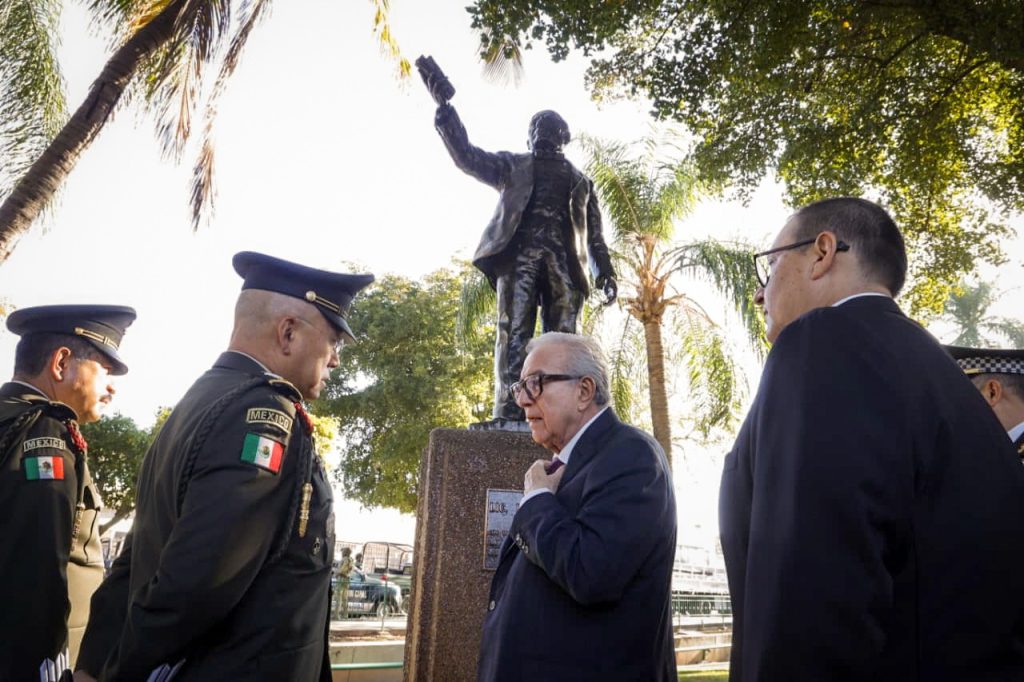 Posteriormente, se montó una guardia de Honor en el monumento erigido en su nombre en los jardines de la Plaza Cívica de Palacio de Gobierno, encabezada por el mandatario estatal y autoridades civiles y militares, para rendir tributo al legado de Benito Juárez.