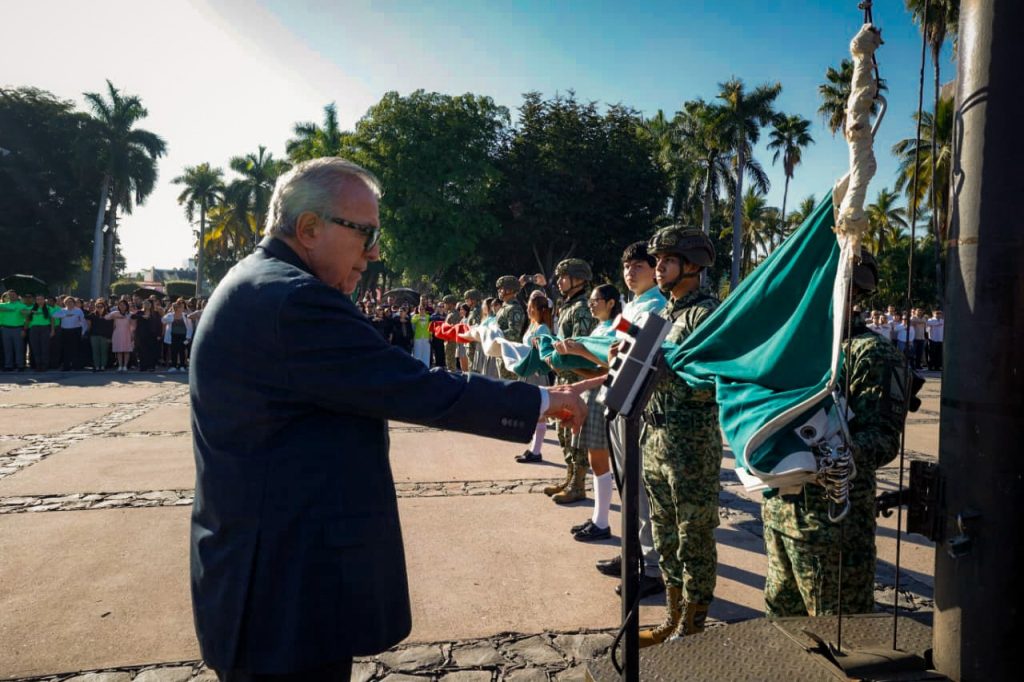CULIACÁN, SINALOA.- Con izamiento de Bandera a toda asta y Honores de Ordenanza en la plaza cívica de Palacio de Gobierno, el gobernador Rubén Rocha Moya, acompañado de autoridades civiles y militares encabezó el acto conmemorativo del 220 aniversario del natalicio de Benito Juárez García, primer y único presidente indígena de México, promotor de las Leyes de Reforma, que sentó las bases de la modernización y el desarrollo del país, así como la consolidación de un Estado democrático.