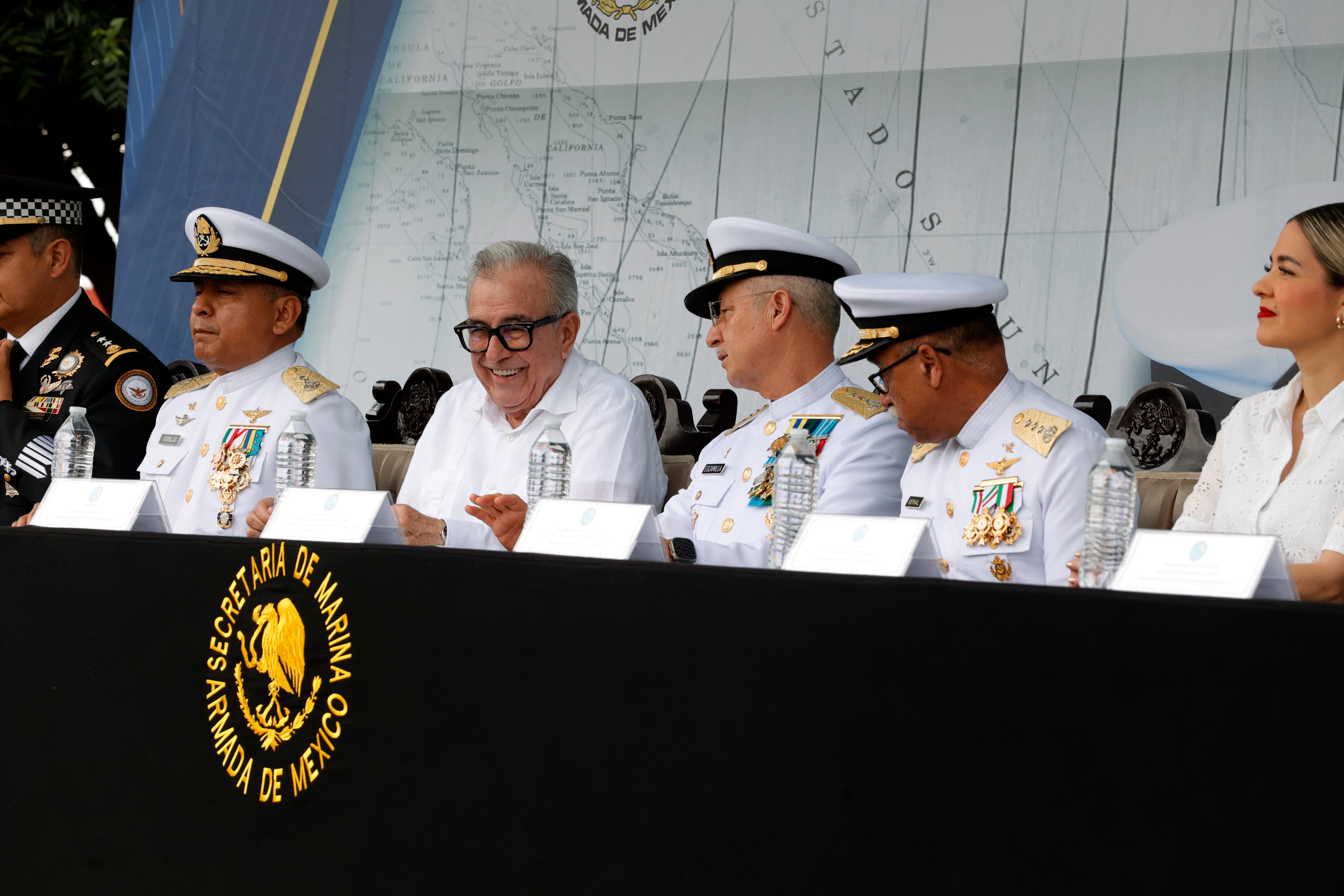 MAZATLÁN, SINALOA.– Al asistir al evento de entrega recepción del Mando de Armas en la Cuarta Región Naval, el gobernador Rubén Rocha Moya dio la bienvenida a Sinaloa a su nuevo comandante, el almirante Guadalupe Juan José Bernal Méndez, con quien expresó su confianza de que continuará la misma coordinación y apoyo de la Armada de México hacia la seguridad en el estado.