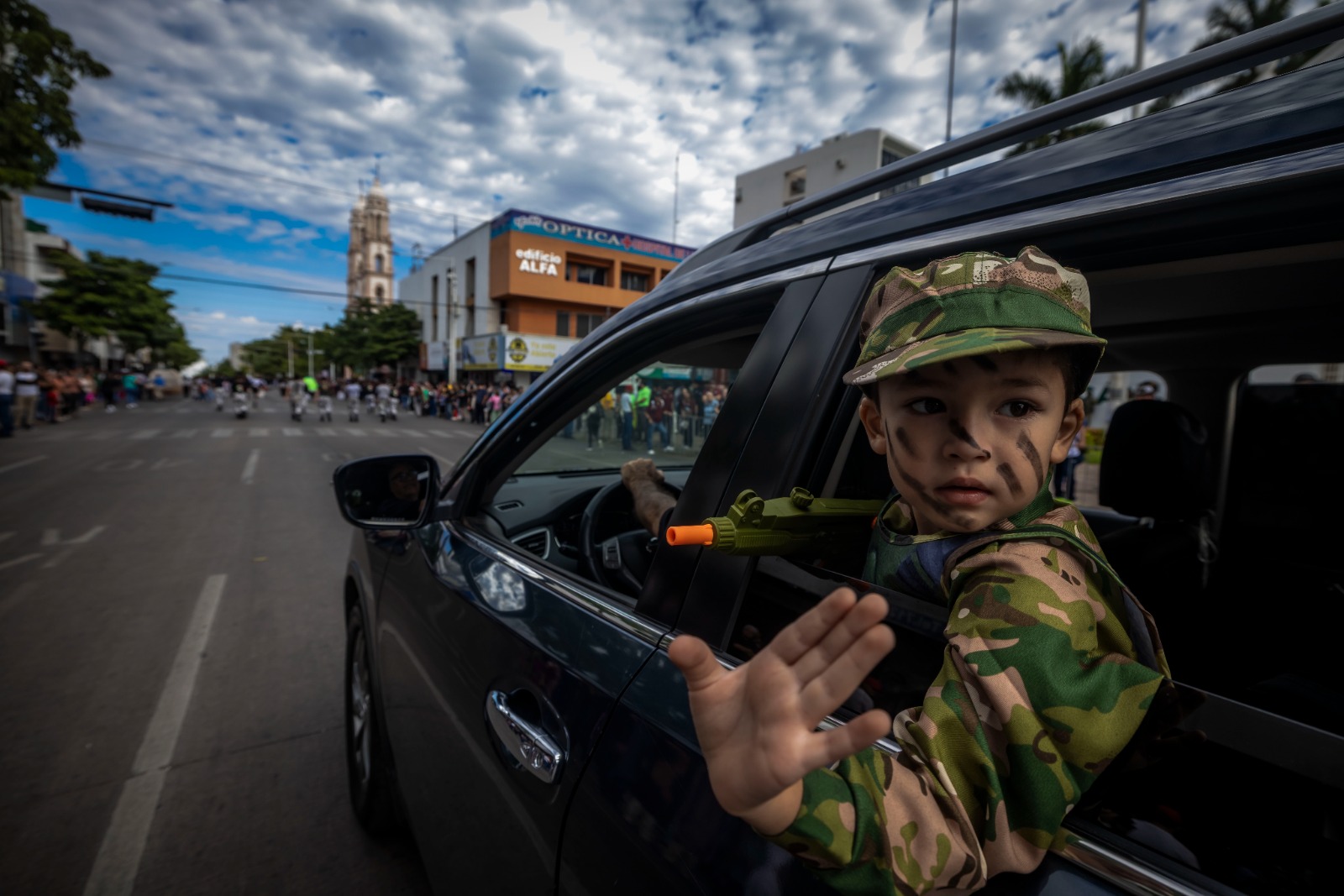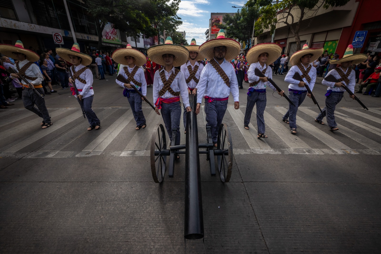 Luego de la conclusión de esta ceremonia, que finalizó con el marcial Toque Tres de Diana en honor a los ascendidos, y el Himno Nacional, el gobernador Rocha, acompañado por los mandos militares y autoridades civiles, subió al balcón de Ayuntamiento para presenciar desde ahí el tradicional desfile cívico militar, que abrió la Banda de Guerra del 94 Batallón de Infantería de la Novena Zona Militar.