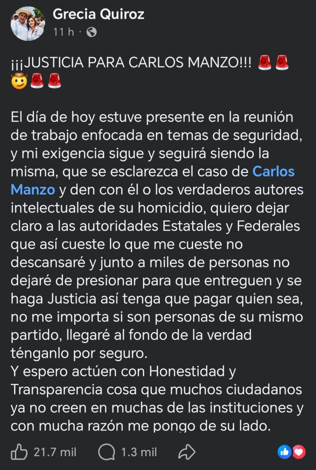 Tras la reunión, Quiroz publicó un mensaje en redes sociales en el que reiteró su demanda de justicia y sostuvo que su exigencia “sigue y seguirá siendo la misma”, al pedir que se esclarezca el homicidio del alcalde.
