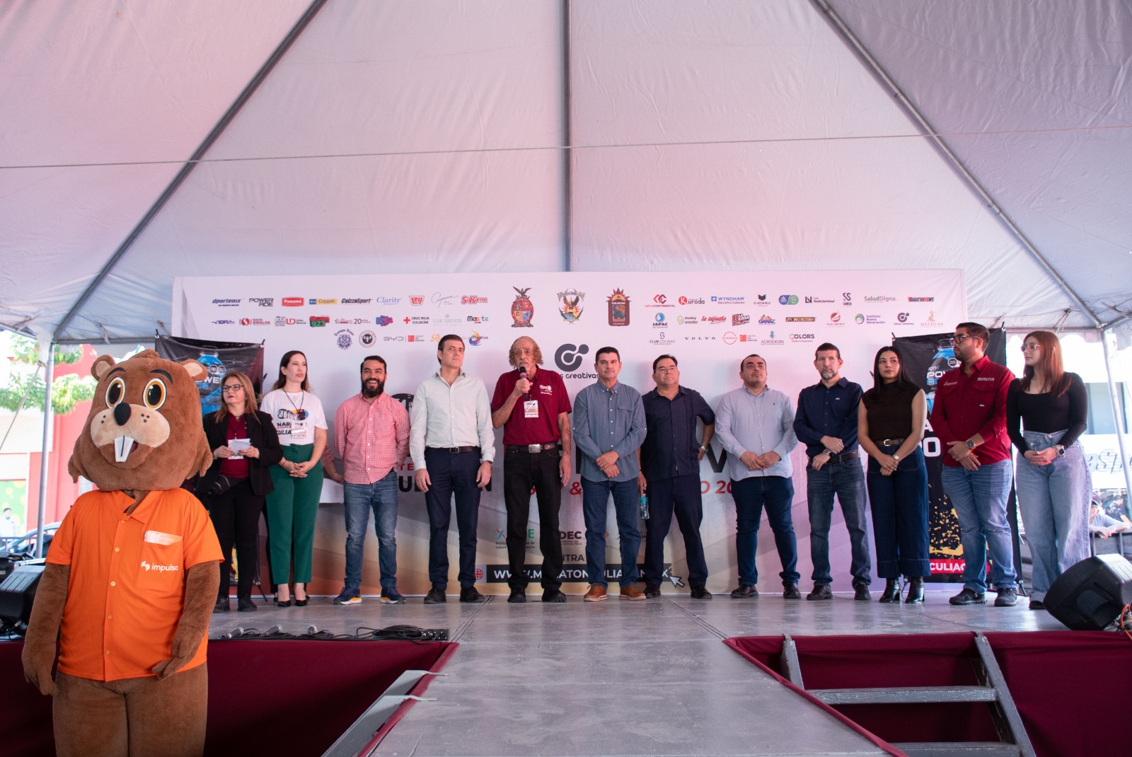 El acto inaugural estuvo encabezado por el presidente del Patronato del Maratón Internacional, acompañado por María Luisa Mercado, coordinadora de la Expo Deportiva; el secretario del Ayuntamiento, José Ernesto Peñuelas Castellanos, y el director del IMDEC, José Alberto Beltrán.