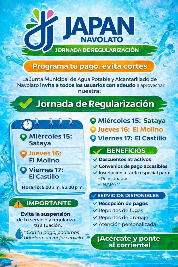 NAVOLATO, SINALOA.- Con el objetivo de acercar los servicios públicos a la población y brindar opciones accesibles para que las familias regularicen su situación, la Junta Municipal de Agua Potable y Alcantarillado de Navolato (JAPAN) anunció la realización de una Jornada de Regularización en distintas comunidades del municipio.