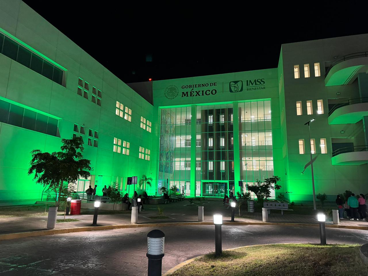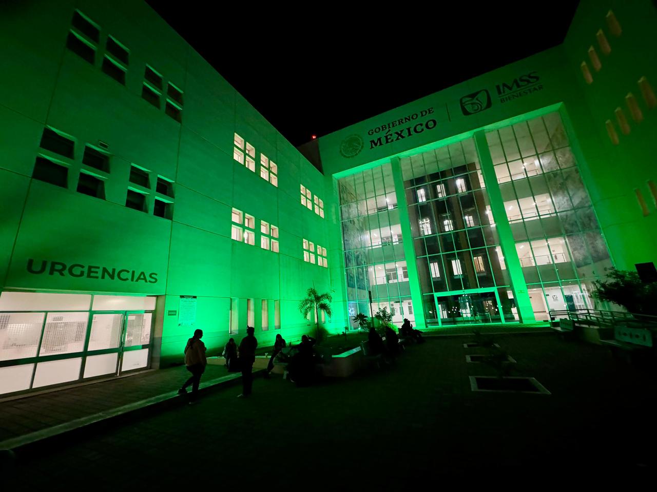Culiacán, Sinaloa.- El Hospital General IMSS Bienestar de Culiacán se iluminó de color verde, un color que simboliza la donación de órganos y tejidos, pues representa la esperanza y la vida que se renueva a través de este acto.