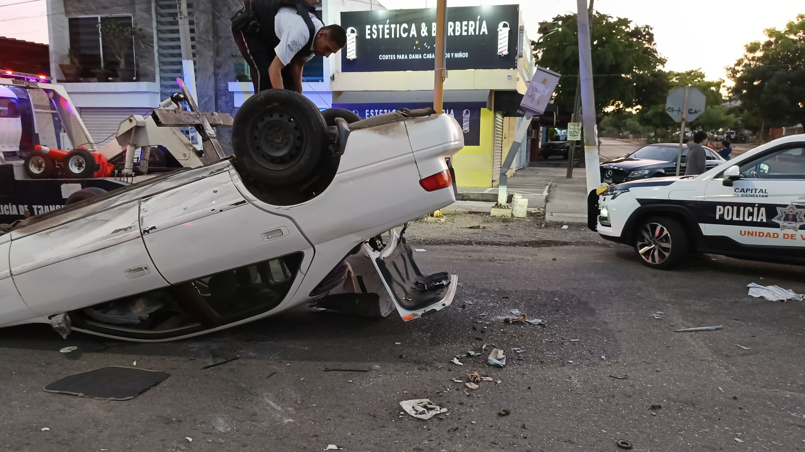 Las autoridades informaron que el vehículo era tripulado por un joven que resultó ileso durante el percance el cual se registró alrededor de las 6:30 de la mañana de este día cuando el joven se quedó dormido y chocó contra un semáforo para luego volcarse y quedar con las llantas hacia arriba en un Toyota Camry de color blanco modelo viejo.