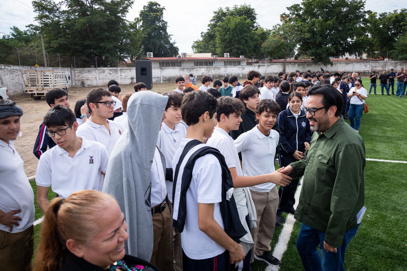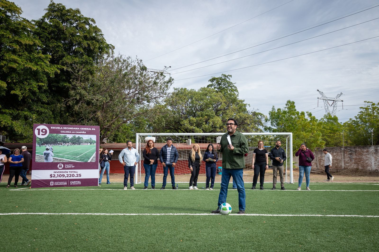CULIACÁN, SINALOA.- El alcalde Juan de Dios Gámez Mendívil entregó una cancha de fútbol con pasto sintético en la escuela secundaria General No. 4 “Pablo de Villavicencio”, ubicada en la colonia Campiña, en Culiacán.