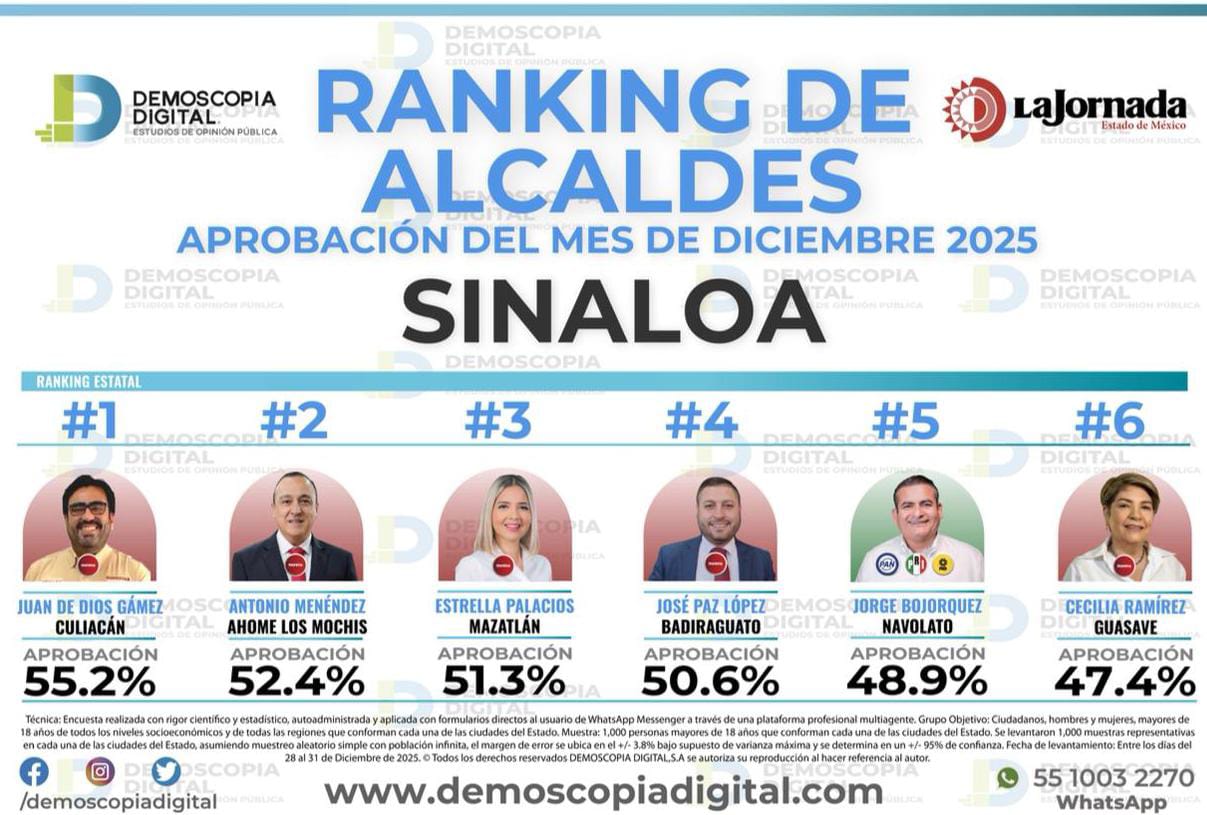 En esta medición se incluye también a los titulares de las alcaldías de Ahome, Antonio Menéndez (52.4), de Mazatlán, Estrella Palacios (51.3), de Badiraguato, José Paz López (50.6), de Navolato, Jorge Bojórquez (48.9) y de Guasave, Cecilia Ramírez (47.4).
