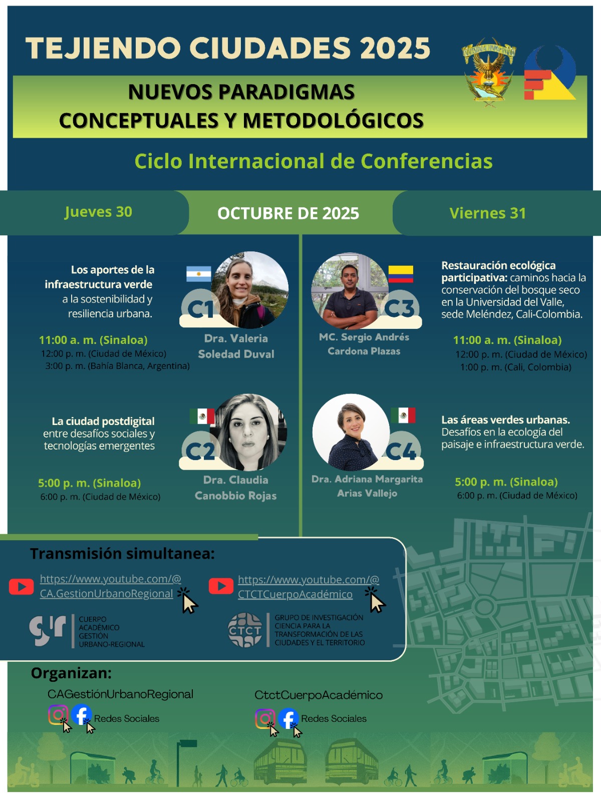Sinaloa.- En el marco del Día Mundial de las Ciudades, la Universidad Autónoma de Sinaloa (UAS), a través de la Facultad de Arquitectura (FAUAS), invita al ciclo de conferencias “Tejiendo Ciudades 2025: Nuevos Paradigmas Conceptuales y Metodológicos”, el cual se desarrollará de manera virtual los días 30 y 31 de octubre.