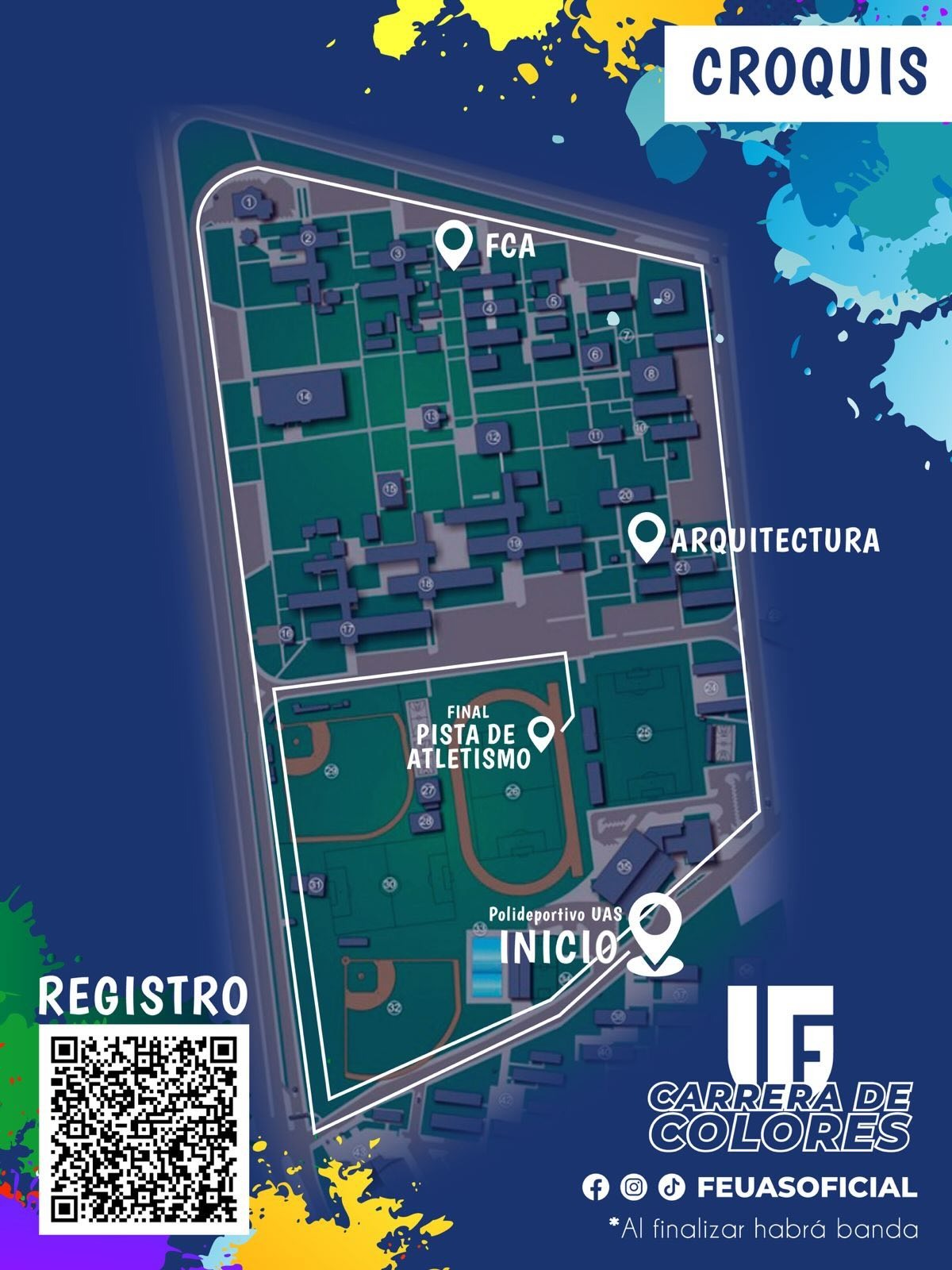 En cuanto a la logística de la primera Carrera de Colores FEUAS 2025, el secretario de actividades culturales y deportivas, Omar López Aispuro detalló que el circuito contempla cerca de 3 kilómetros de recorrido, tendrá como punto de partida y meta el estacionamiento entre las Facultades de Ingeniería y de Ciencias Químico-Biológicas. Agregó que se contará con puntos de hidratación, rutas marcadas, voluntarios apoyando durante todo el recorrido, así como fisioterapeutas, ambulancia y el acompañamiento de la Secretaría de Seguridad y Tránsito Municipal para garantizar el bienestar de los participantes.