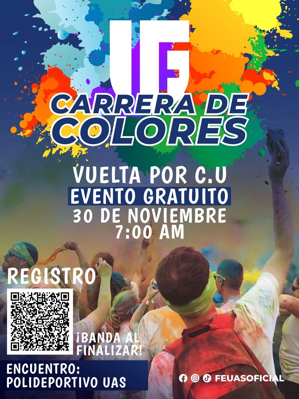 Culiacán, Sinaloa.- La Federación de Estudiantes de la Universidad Autónoma de Sinaloa (FEUAS) invita a la comunidad universitaria a participar en la Carrera de Colores, que se realizará el próximo domingo 30 de noviembre, a las 7:00 de la mañana, teniendo como punto de encuentro el estacionamiento de la Facultad de Ingeniería en Ciudad Universitaria.