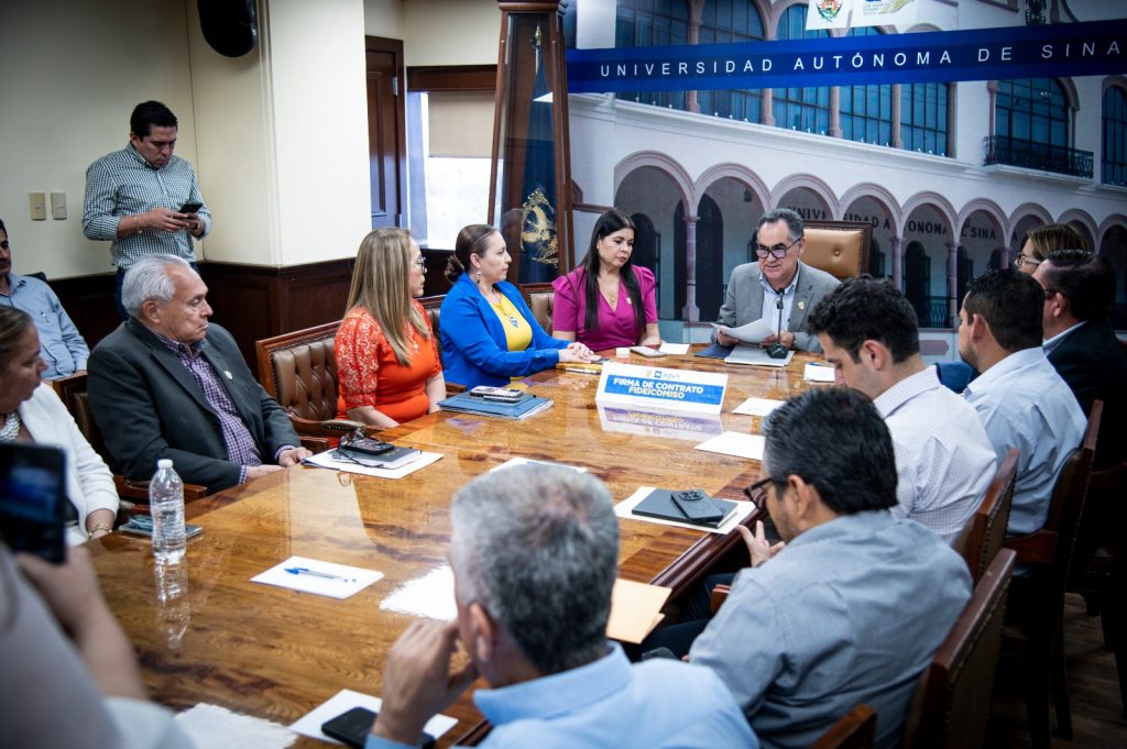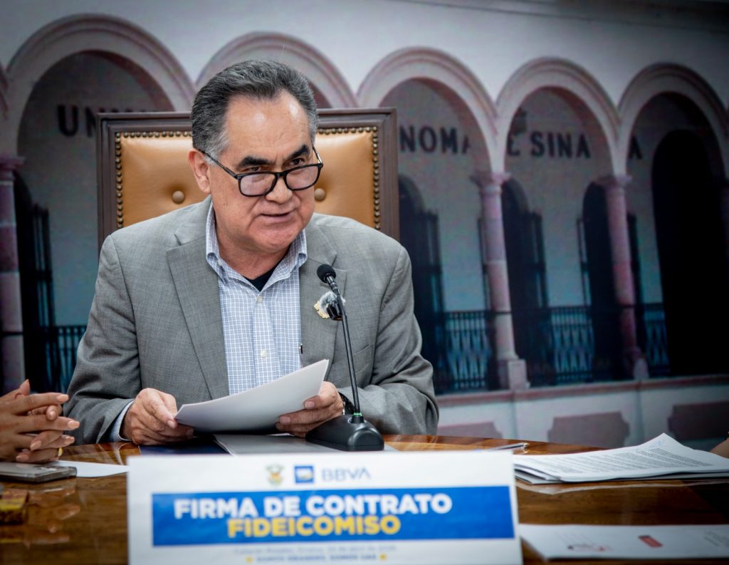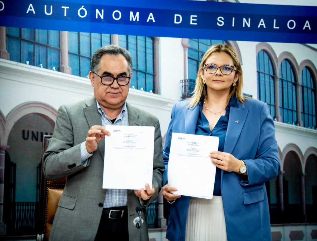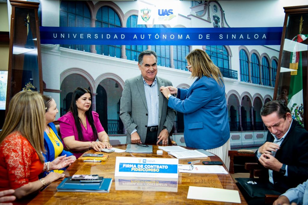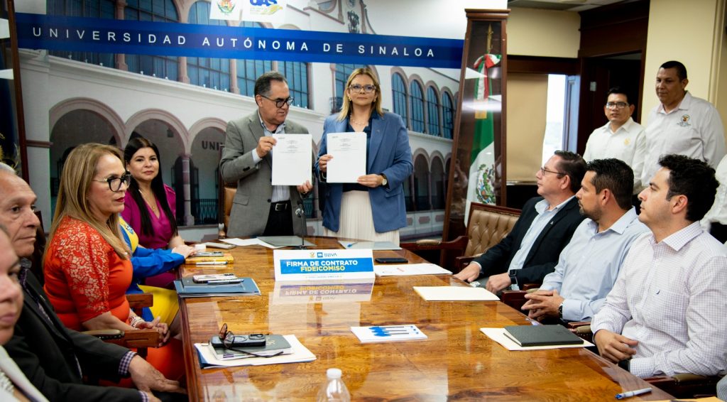 Por parte de la Universidad, firmó el documento el rector, doctor Jesús Madueña Molina; por parte del banco, la delegada fiduciaria de BBVA, la maestra Laizmy Zuhei Sandoval Vega.