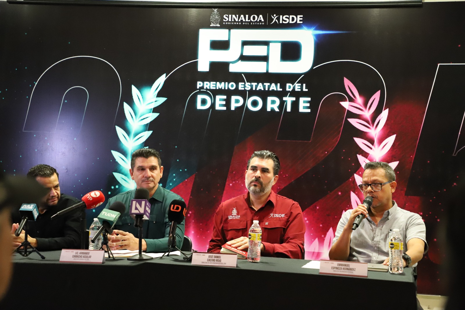 El Director General del ISDE, Armando Camacho Aguilar, acompañado por el subdirector Daniel Gutiérrez; el director de Alto Rendimiento, Daniel Castro, y Emmanuel Espinoza, encargado del Premio Estatal del Deporte, dio a conocer los pormenores de la convocatoria.