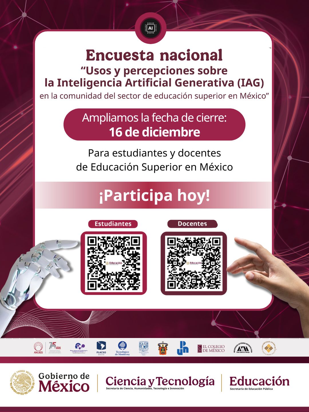 Se trata de un estudio diseñado para recopilar información sobre el uso de la Inteligencia Artificial Generativa en la educación superior en México. Los resultados servirán para generar evidencia de calidad que apoye a las instituciones en el diseño de buenas prácticas y lineamientos que favorezcan una adopción responsable e incluyente de esta tecnología.