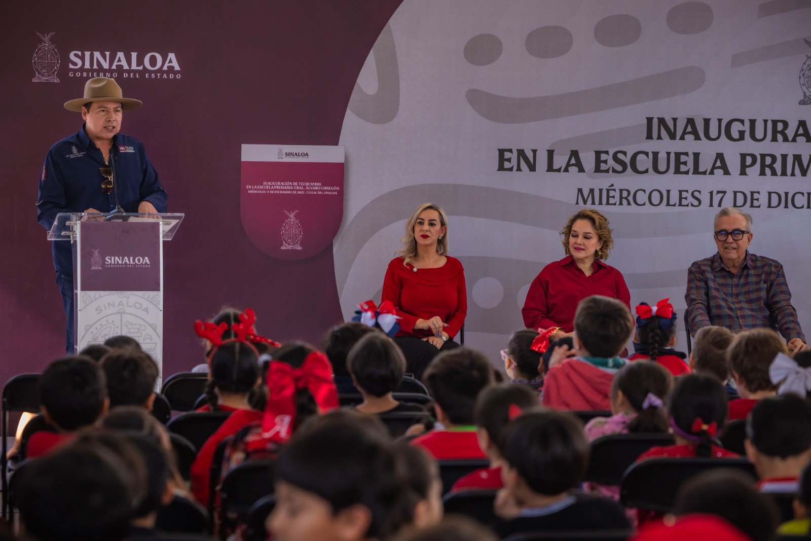 Culiacán, Sinaloa.- Comprometido con la educación y la mejora de la infraestructura en las escuelas del estado, a fin de que las y los niños tengan espacios dignos para realizar sus actividades recreativas y de desarrollo físico, el gobernador Rubén Rocha Moya inauguró la techumbre y barda perimetral en la escuela primaria Álvaro Obregón.