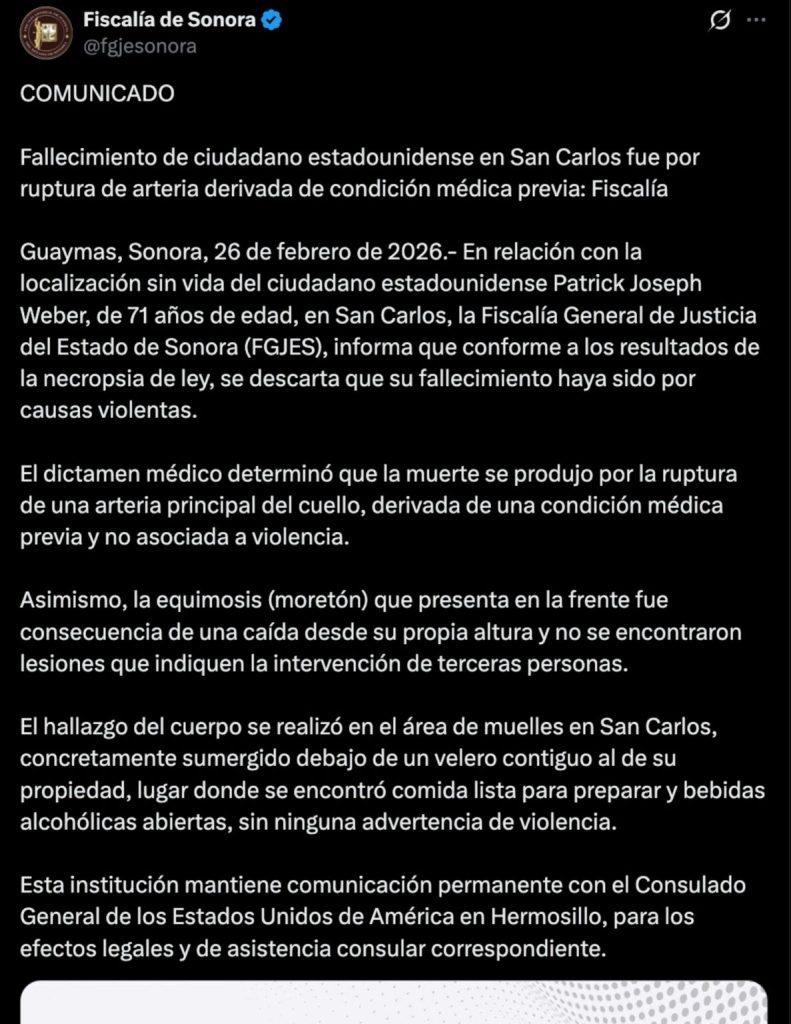 SONORA.- La Fiscalía General de Justicia del Estado de Sonora (FGJES) confirmó que el fallecimiento de Patrick Joseph Weber, ciudadano estadounidense de 71 años hallado sin vida en San Carlos, se debió a una condición médica preexistente y no a un acto criminal.