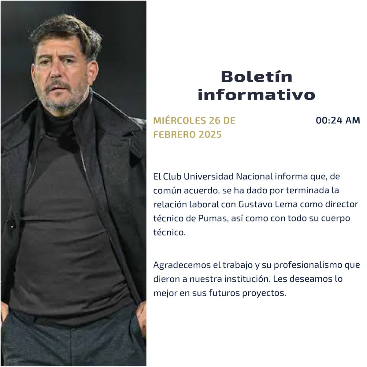 “El Club Universidad Nacional informa que, de común acuerdo, se ha dado por terminada la relación laboral con Gustavo Lema como director técnico de Pumas, así como con todo su cuerpo técnico”, explicó en una nota de prensa el cuadro universitario.
