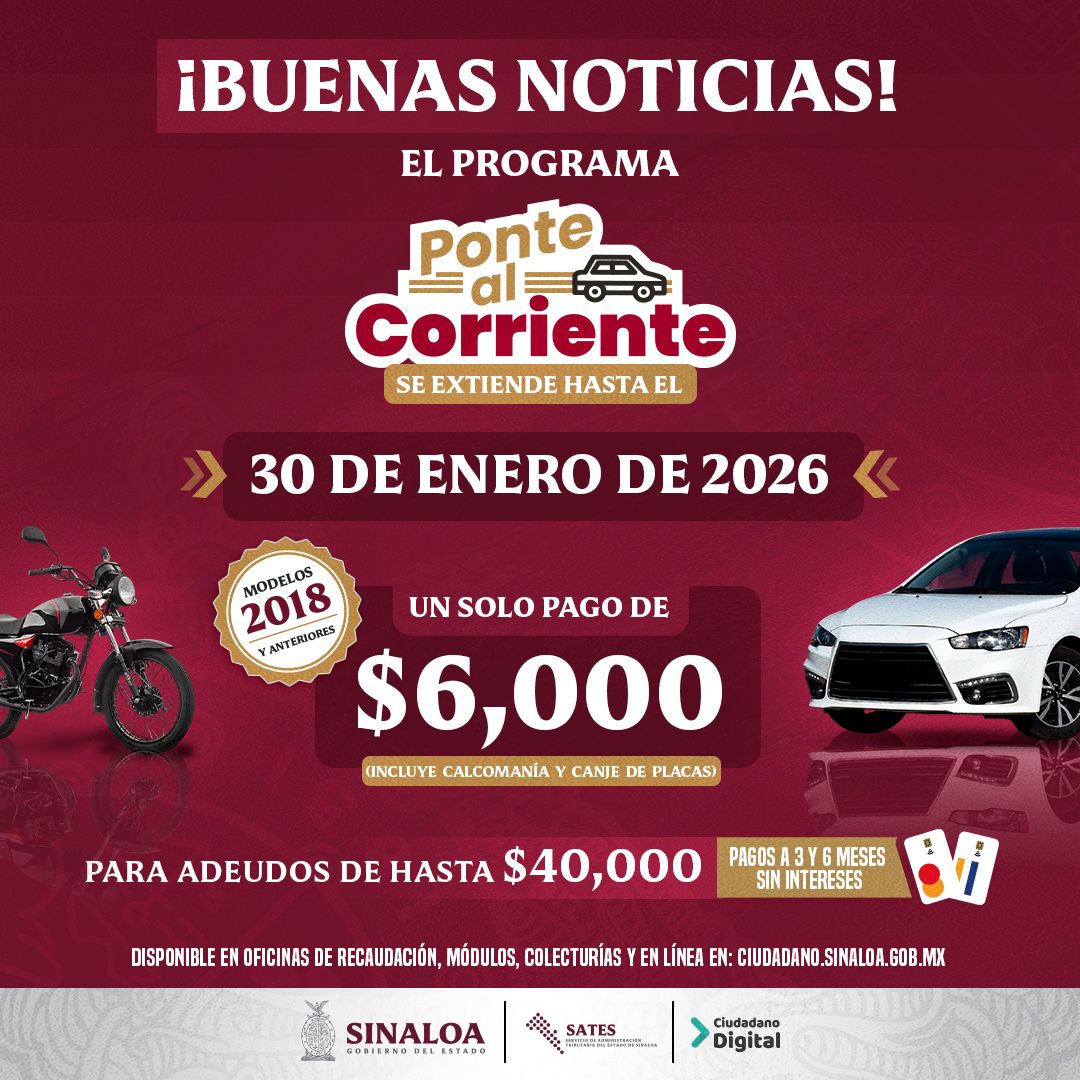 Culiacán, Sinaloa.- Con la finalidad de que los propietarios de vehículos con adeudos puedan aprovechar el beneficio, el Servicio de Administración Tributaria del Estado de Sinaloa (SATES), amplia el programa “Ponte al Corriente”, que originalmente se llevaría a cabo del 18 de agosto al 31 de diciembre, y que ahora estará vigente hasta el 30 de enero del presente año.