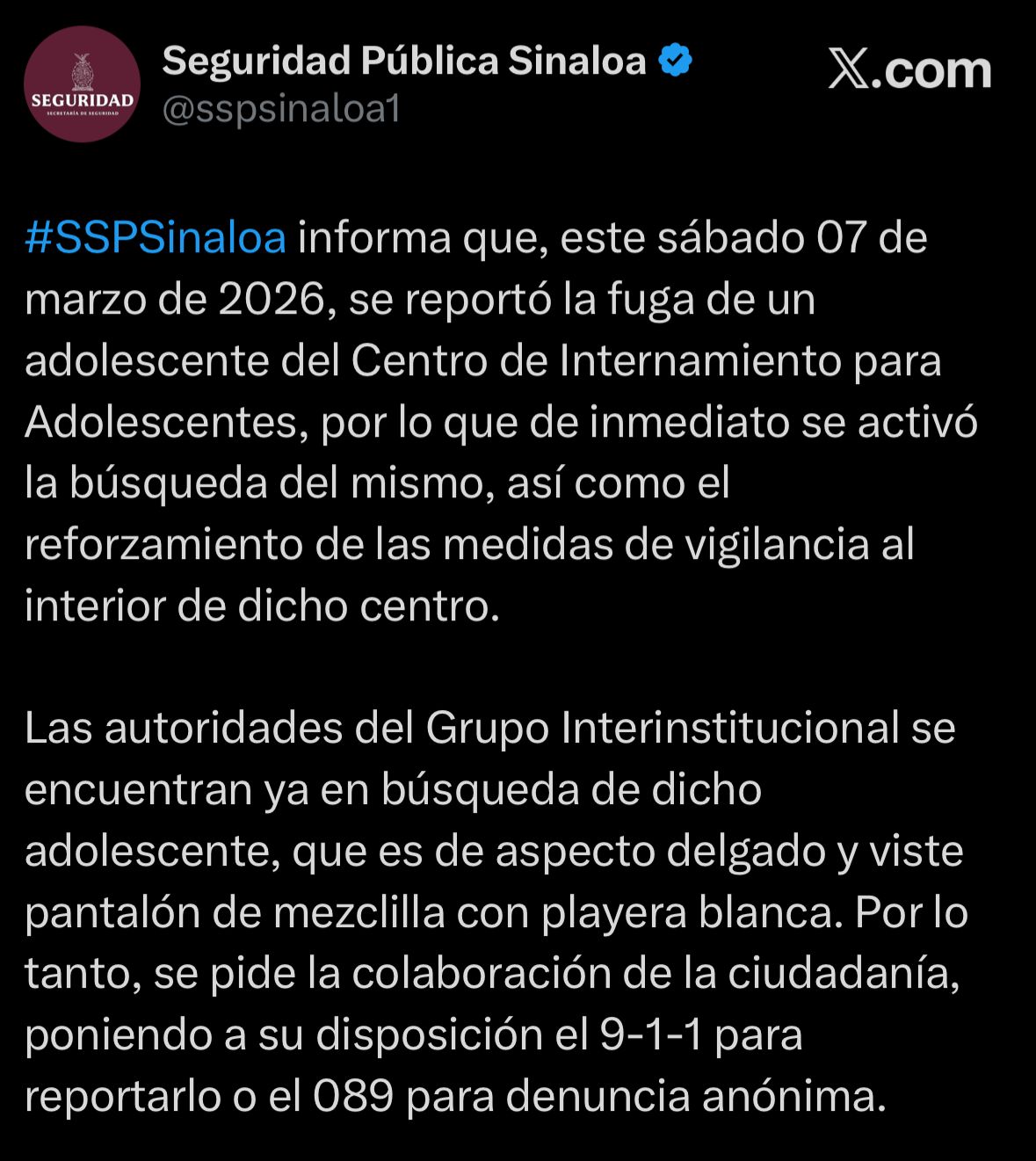 CULIACÁN, SINALOA.- Un joven que estaba internado en el centro de internamiento para adolescentes CIA mejor conocido como tutelar para menores se fugó durante la tarde de este sábado 7 de marzo del 2026 por lo que se implementó un operativo de búsqueda donde hasta el momento los resultados han sido negativos.