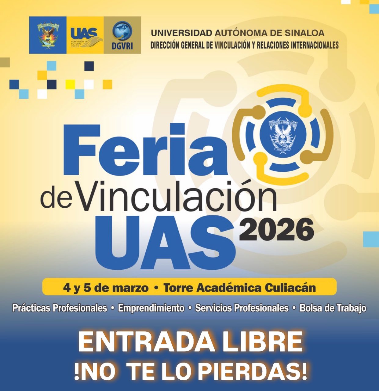 CULIACÁN, SINALOA.- Inicia la cuenta regresiva y todo se encuentra listo para el relevante encuentro de vinculación entre la academia, el sector productivo y el gobierno en Sinaloa: la “Feria de Vinculación UAS 2026”. Organizada por la Dirección General de Vinculación y Relaciones Internacionales (DGVRI), se realizará los próximos 4 y 5 de marzo en la Torre Académica Culiacán, con entrada libre para toda la sociedad, según informó su titular, el doctor Jesús Sánchez Zazueta.