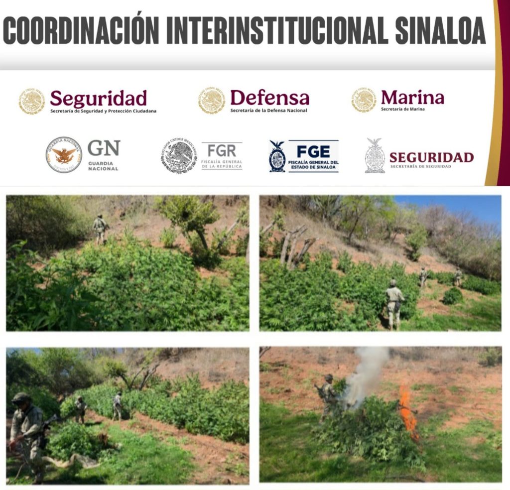 BADIRAGUATO, SINALOA.- Elementos del Ejército Mexicano, en coordinación con la Guardia Nacional, la Secretaría de Marina, la Secretaría de Seguridad y Protección Ciudadana, la Fiscalía General de la República, la Fiscalía General del Estado y la Secretaría de Seguridad Pública de Sinaloa, a través de la Policía Estatal Preventiva, ubicaron tres plantíos de marihuana en el municipio de Badiraguato.